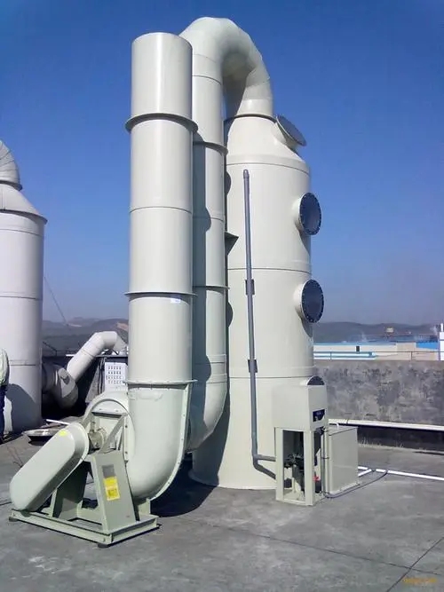 然后進入噴淋層,噴淋形式采用雙層填料和兩級噴淋,使氣液充足接觸,提高了凈化效率。該塔配有玻璃鋼離心風(fēng)機、塑料水泵或不銹鋼水泵。當(dāng)處理風(fēng)量在10000立方米以上時,兩臺泵即可滿足要求。